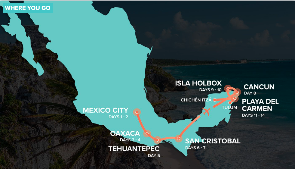 Vom wunderschönen San Cristobal aus nehmen wir heute einen Flug über Mexiko und landen ohne Zeitverlust in der wunderschönen Stadt Cancun. Auf der Halbinsel Yucatán gelegen, bekommen wir unseren ersten Vorgeschmack auf karibische Glückseligkeit.
